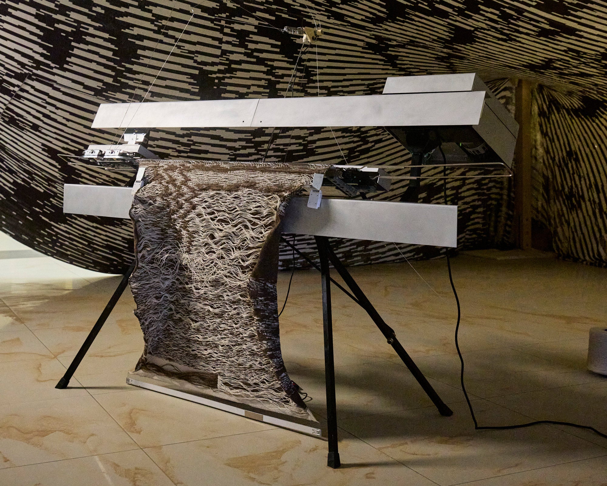 Inspired by the intricate patterns found on the shell of the ancient Asari clam, A Thousand Layers of Stomach is an abstract work by A.A.Murakami, that explores the intersection of nature and technology through a creative code that replicates the natural processes of Asari clam shell formation. An on-site custom knitting machine translates the artist-generated code to produce expansive textile wall pieces that capture the evolutionary beauty of the clam’s mesmerizing array of abstract shell patterns.